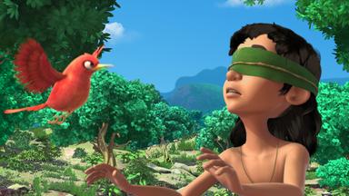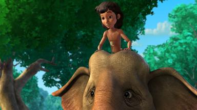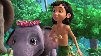 Mogli pustet in eine Blume und wird durch den Blütenstaub blind. Balu macht sich auf die Suche nach einer Pflanze, die Mogli helfen kann.